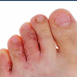 It's caused by a fungus that grows in warm, damp areas of skin, such as between your toes. The infection makes your skin itchy, flaky and red. The soles of your foot can also become dry and scaly. You might get blisters too.