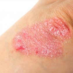 It's characterized by skin cells that multiply up to 10 times faster than normal. As underlying cells reach the skin's surface and die, their sheer volume causes raised, red plaques covered with white scales. Psoriasis typically occurs on the knees, elbows, and scalp, and it can also affect the torso, palms, and soles of the feet.